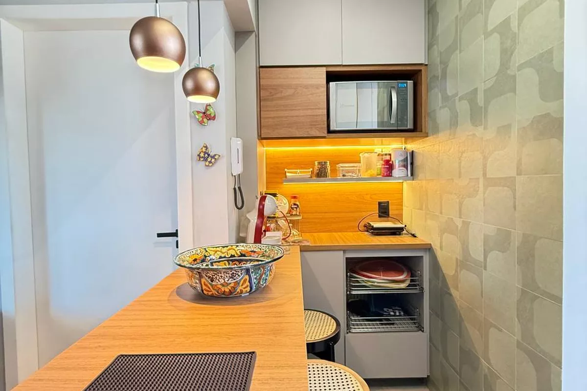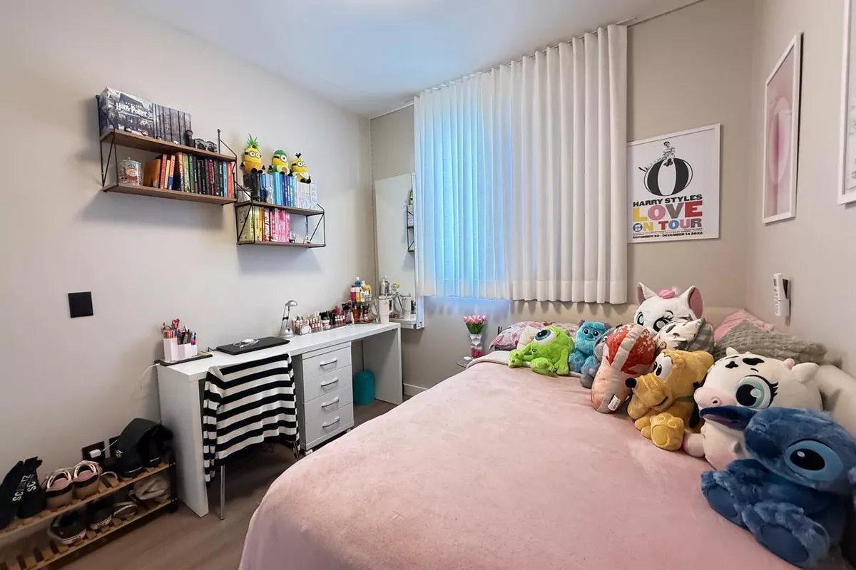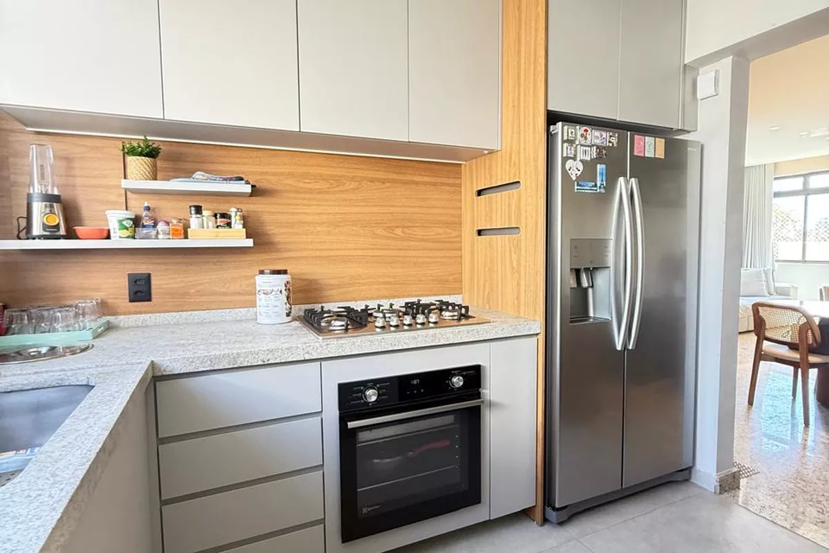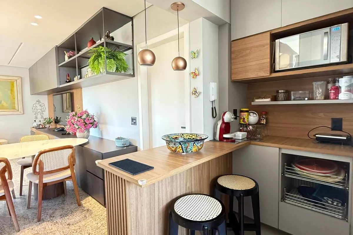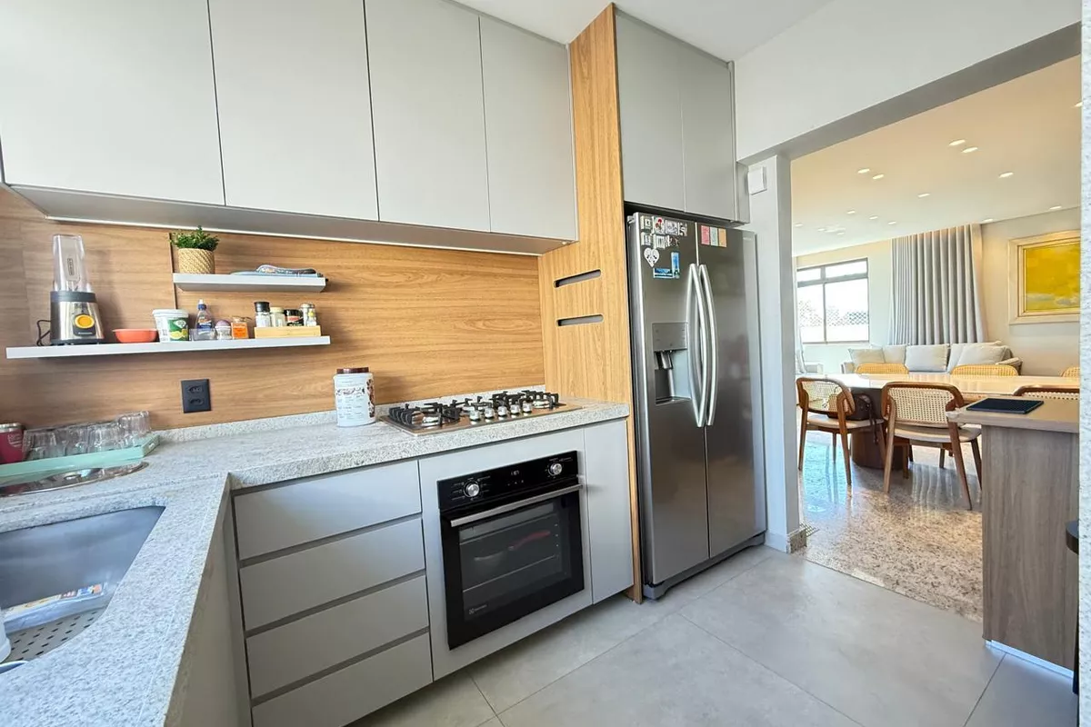 Sala para 2 ambientes com teto rebaixado em gesso com projeto de iluminação; 3 quartos com armários, sendo 1 suíte com closet; escritório; banhos com box, armários e espelhos; cozinha estilo americana com armários e área de serviço independente; 2 vagas de garagem em linha.