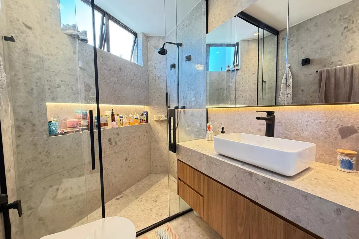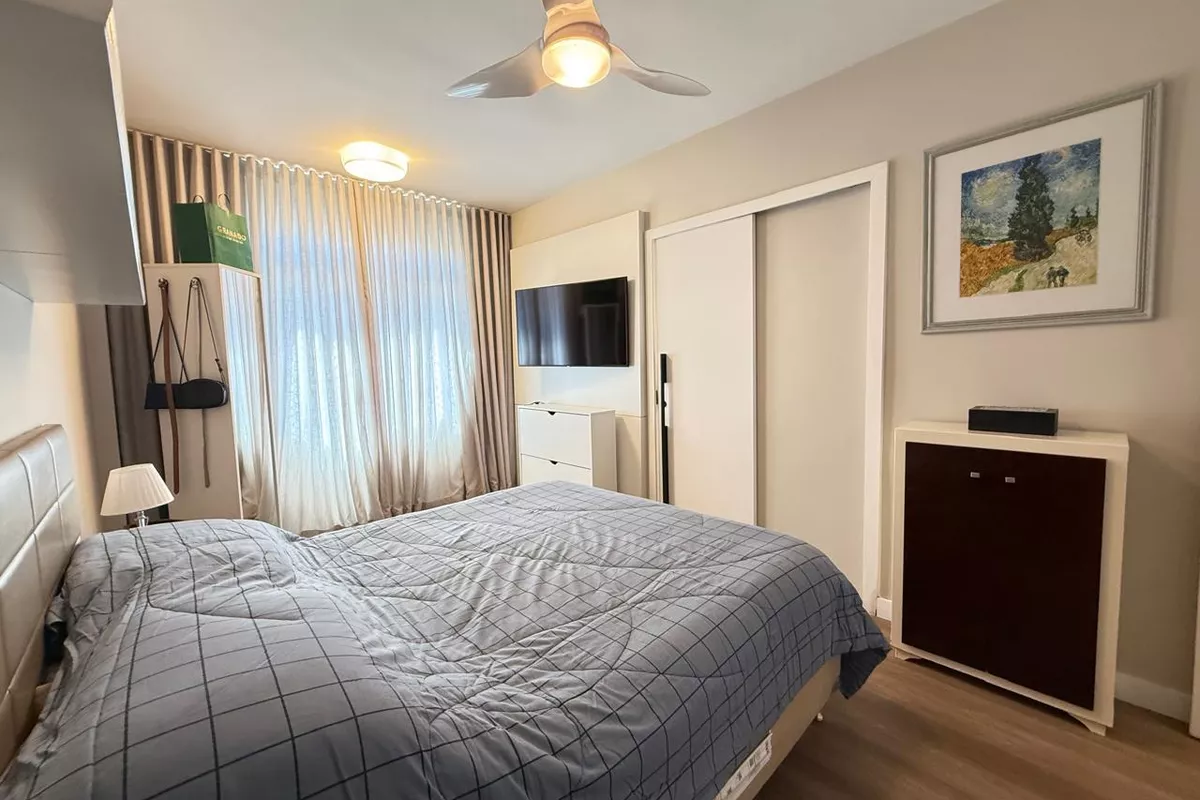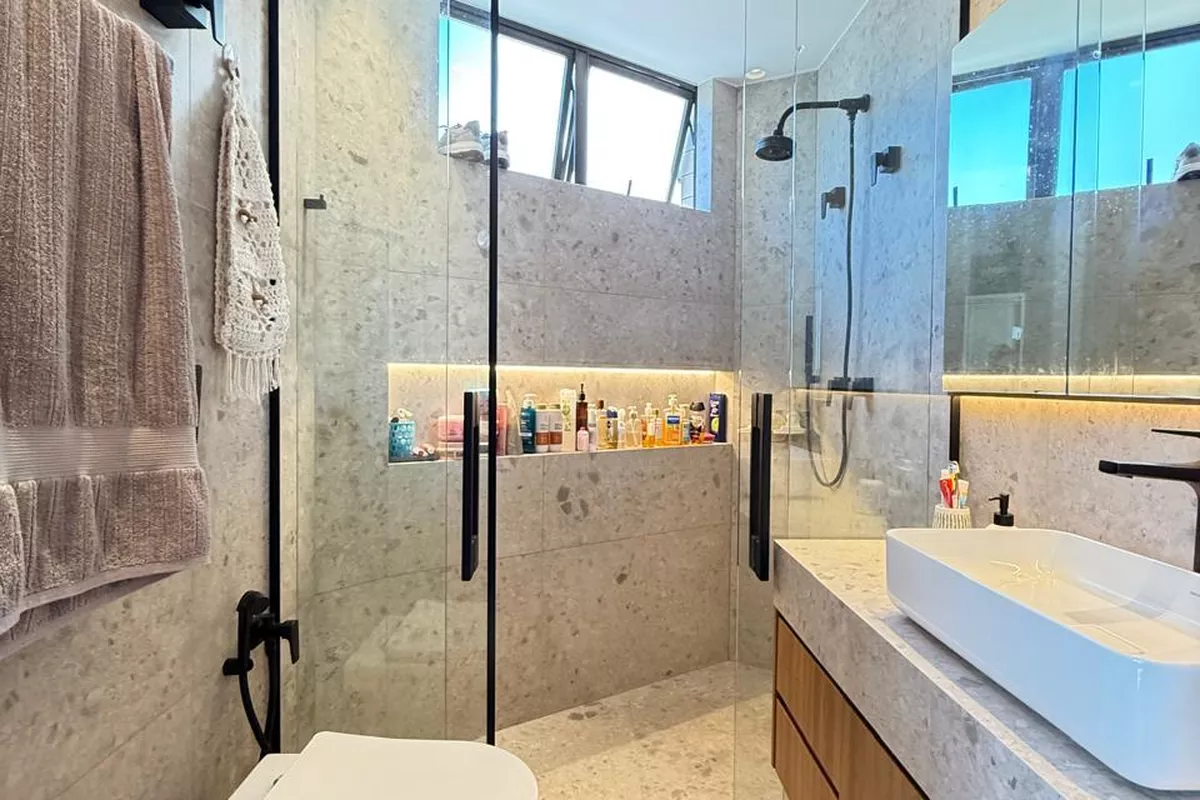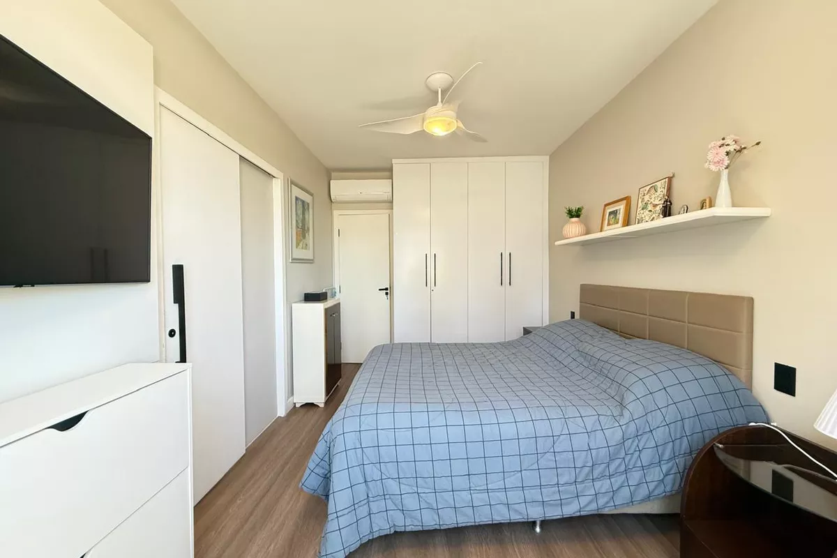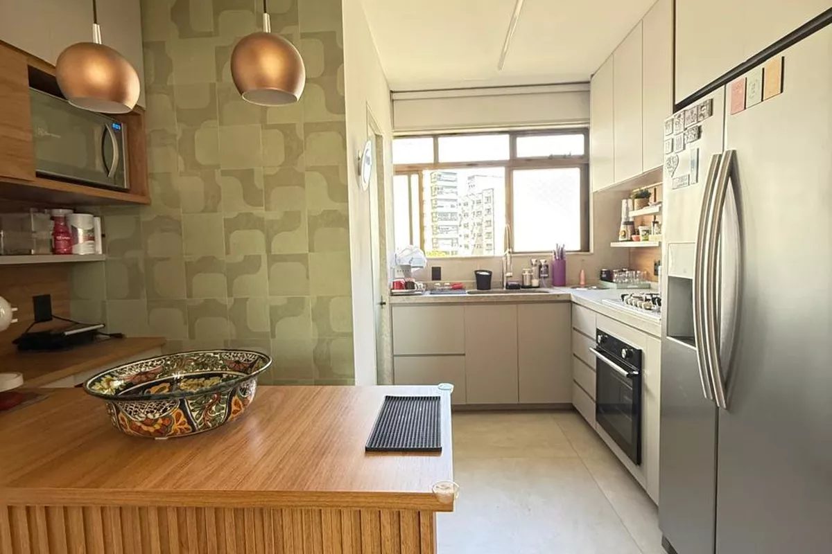 Sala para 2 ambientes com teto rebaixado em gesso com projeto de iluminação; 3 quartos com armários, sendo 1 suíte com closet; escritório; banhos com box, armários e espelhos; cozinha estilo americana com armários e área de serviço independente; 2 vagas de garagem em linha.
