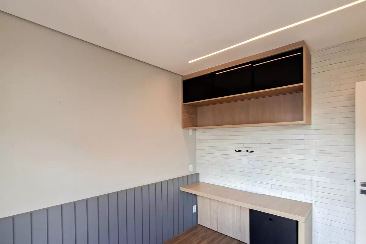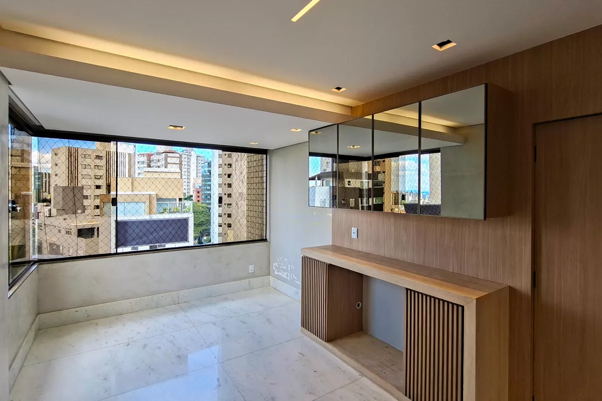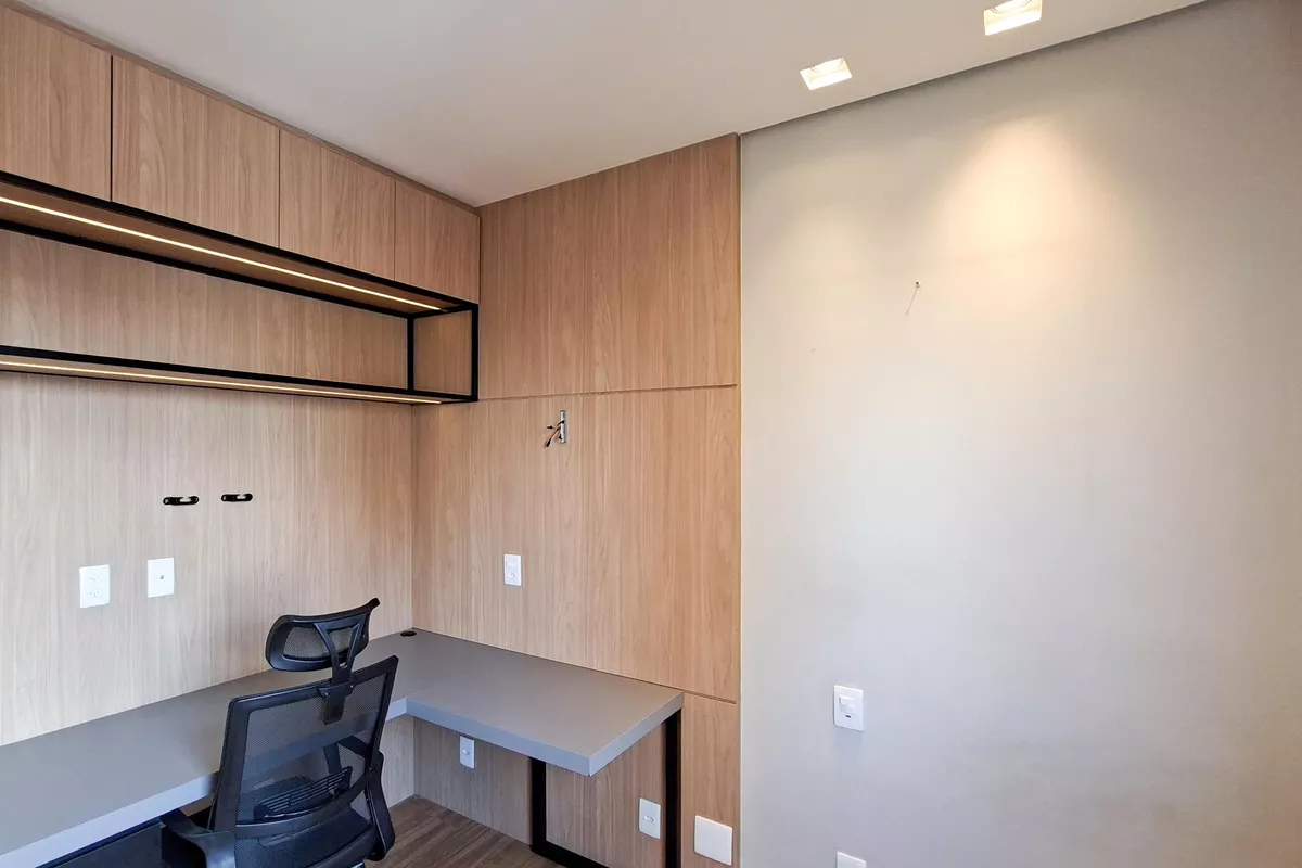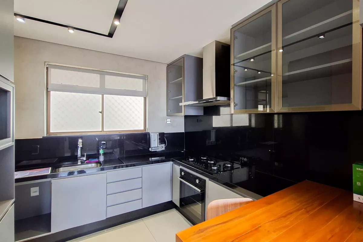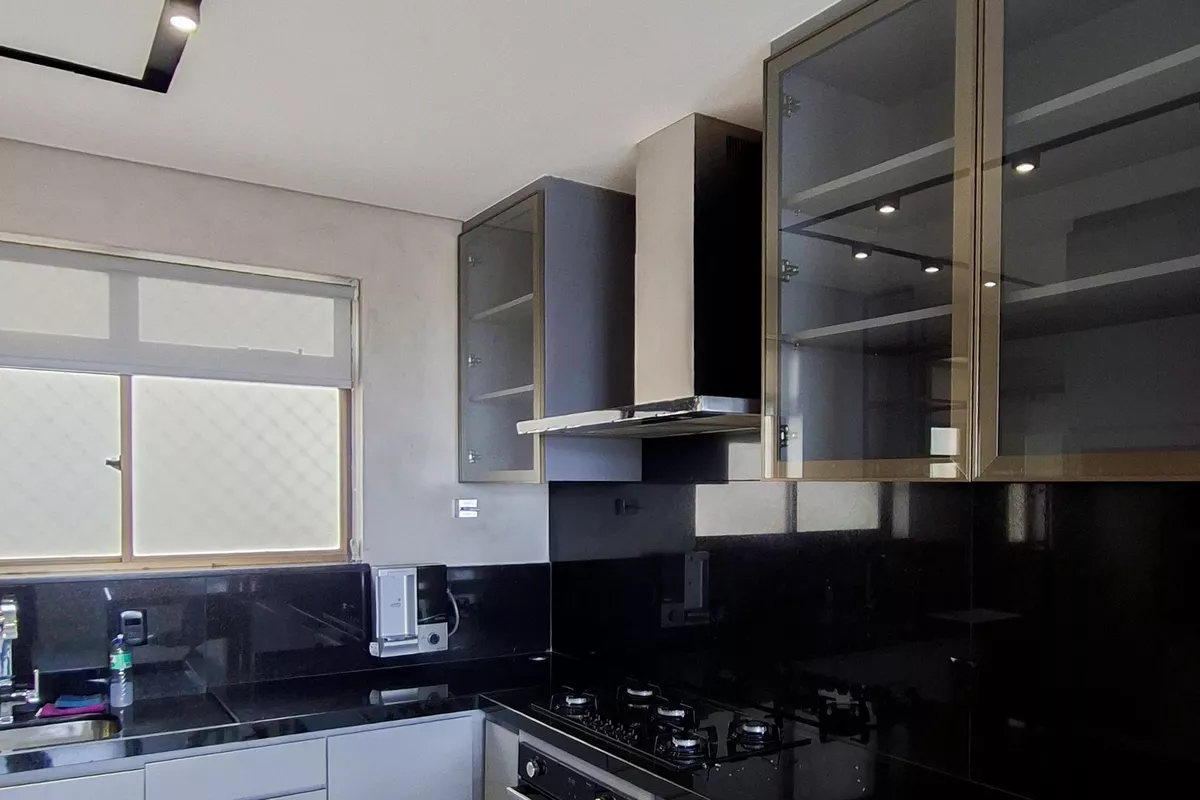 Sala para 2 ambientes com piso em mármore, teto em gesso com projeto de iluminação, painéis em madeira; lavabo; varanda integrada com cortina de vidro; 3 quartos, sendo 1 suíte com armários espelhados, com piso vinílico, armários e ar-condicionado; rouparia; banhos com piso em porcelanato, bancadas em granito com armários, box e espelhos; cozinha com piso em porcelanato, bancadas em granito com armários, bancada em madeira para lanche; área de serviço; 2 vagas de garagem livres, cobertas e demarcadas + box de despejo.