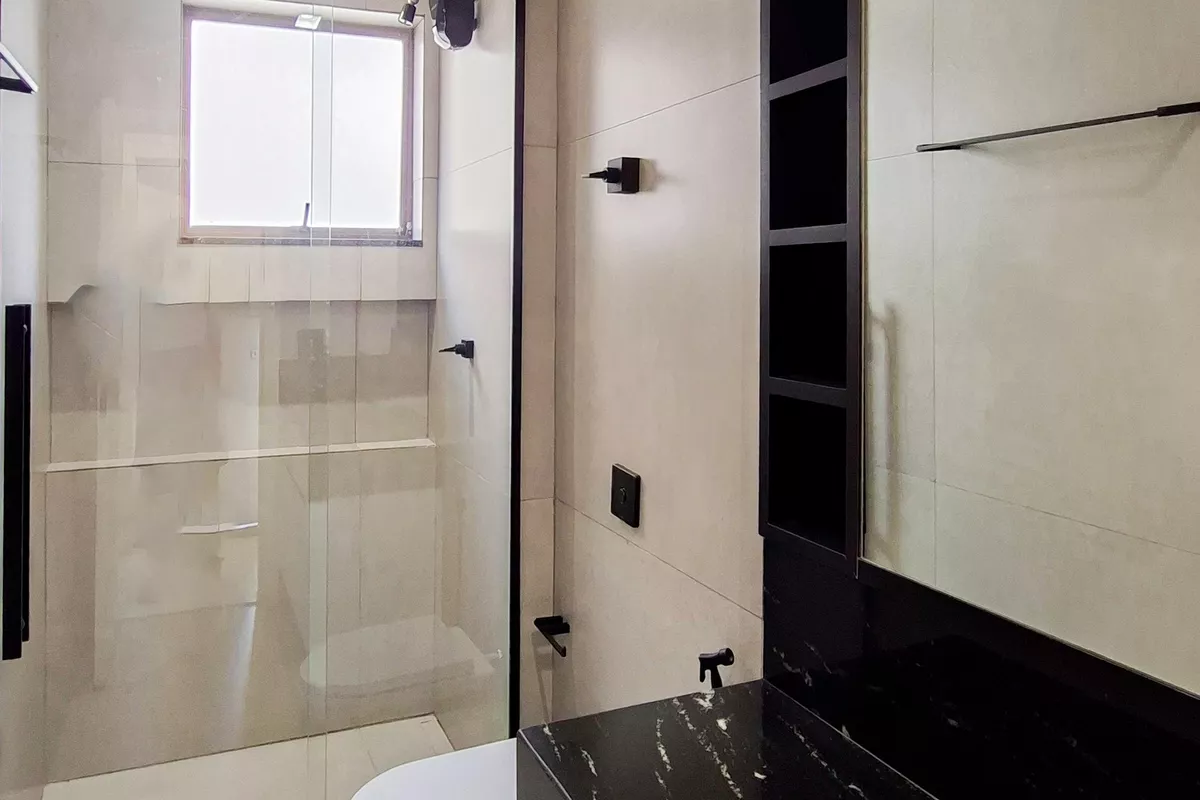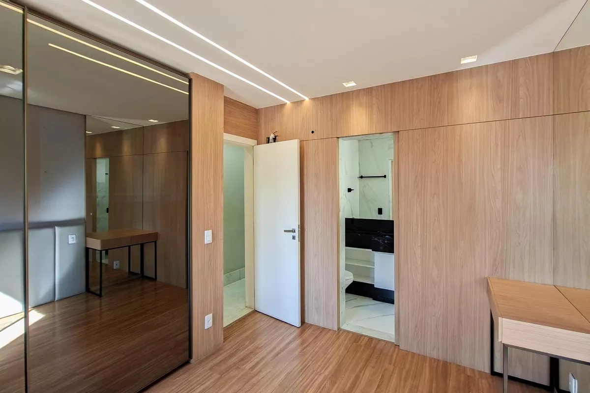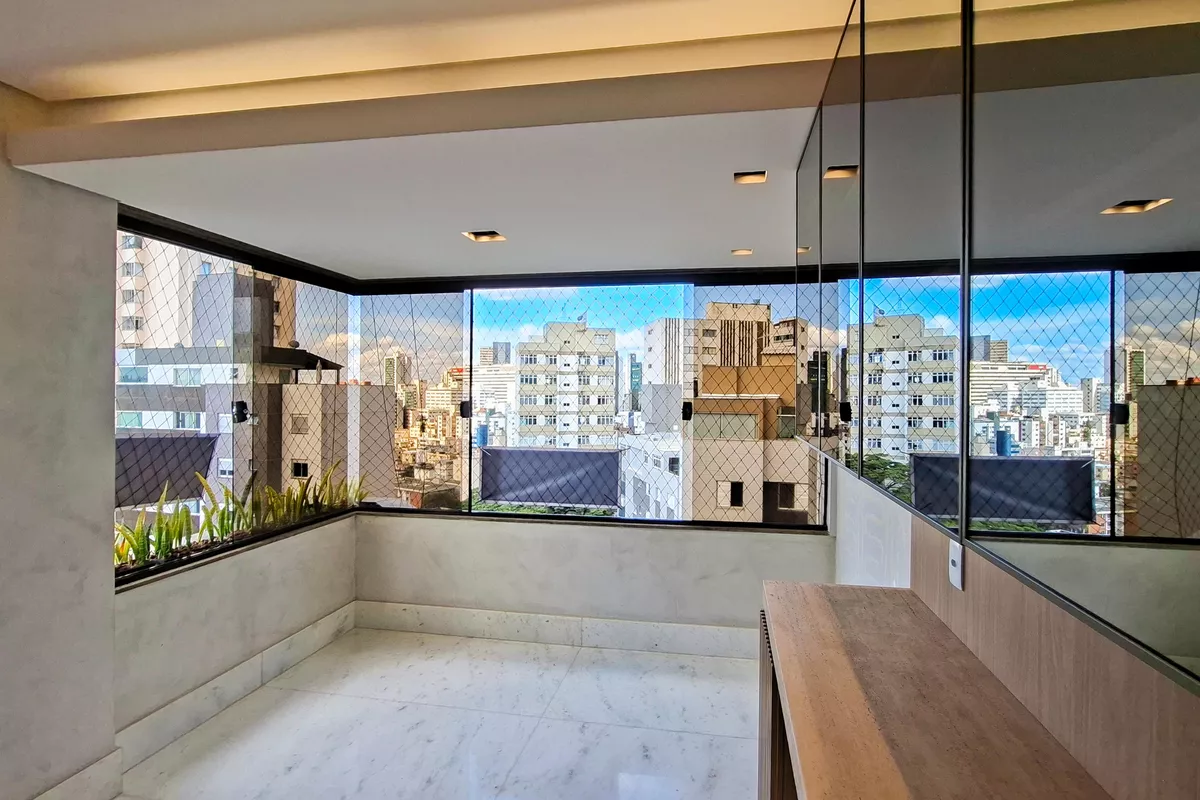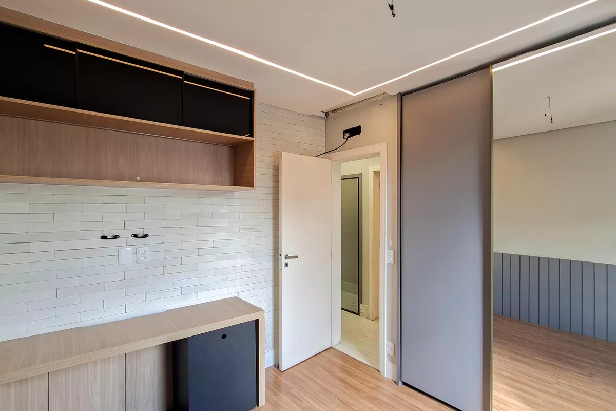 Sala para 2 ambientes com piso em mármore, teto em gesso com projeto de iluminação, painéis em madeira; lavabo; varanda integrada com cortina de vidro; 3 quartos, sendo 1 suíte com armários espelhados, com piso vinílico, armários e ar-condicionado; rouparia; banhos com piso em porcelanato, bancadas em granito com armários, box e espelhos; cozinha com piso em porcelanato, bancadas em granito com armários, bancada em madeira para lanche; área de serviço; 2 vagas de garagem livres, cobertas e demarcadas + box de despejo.