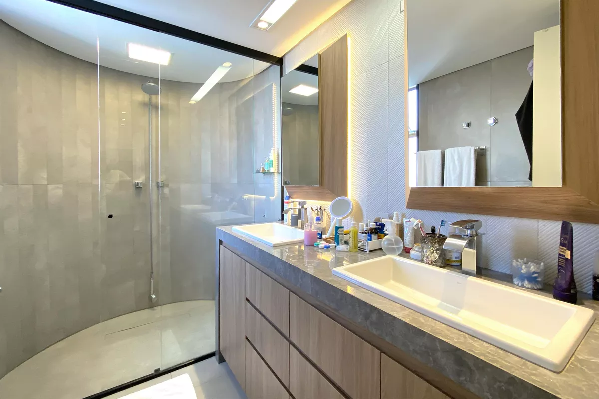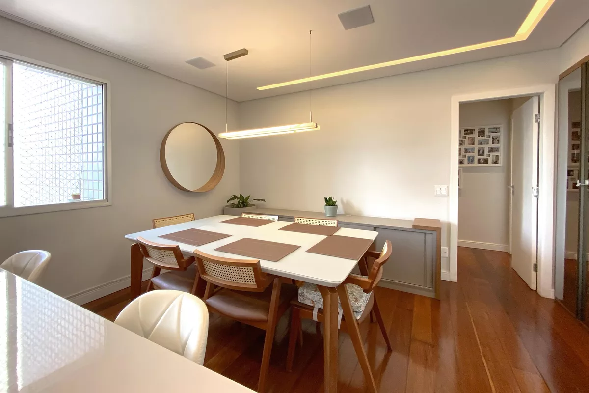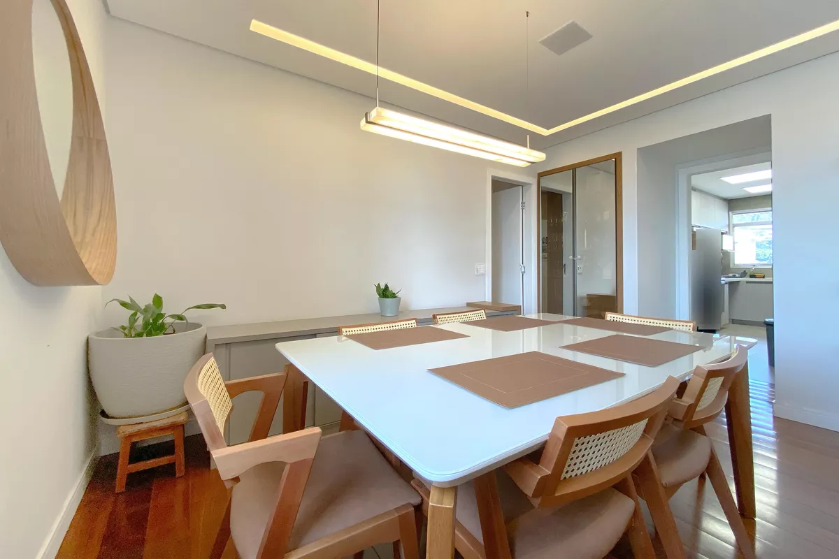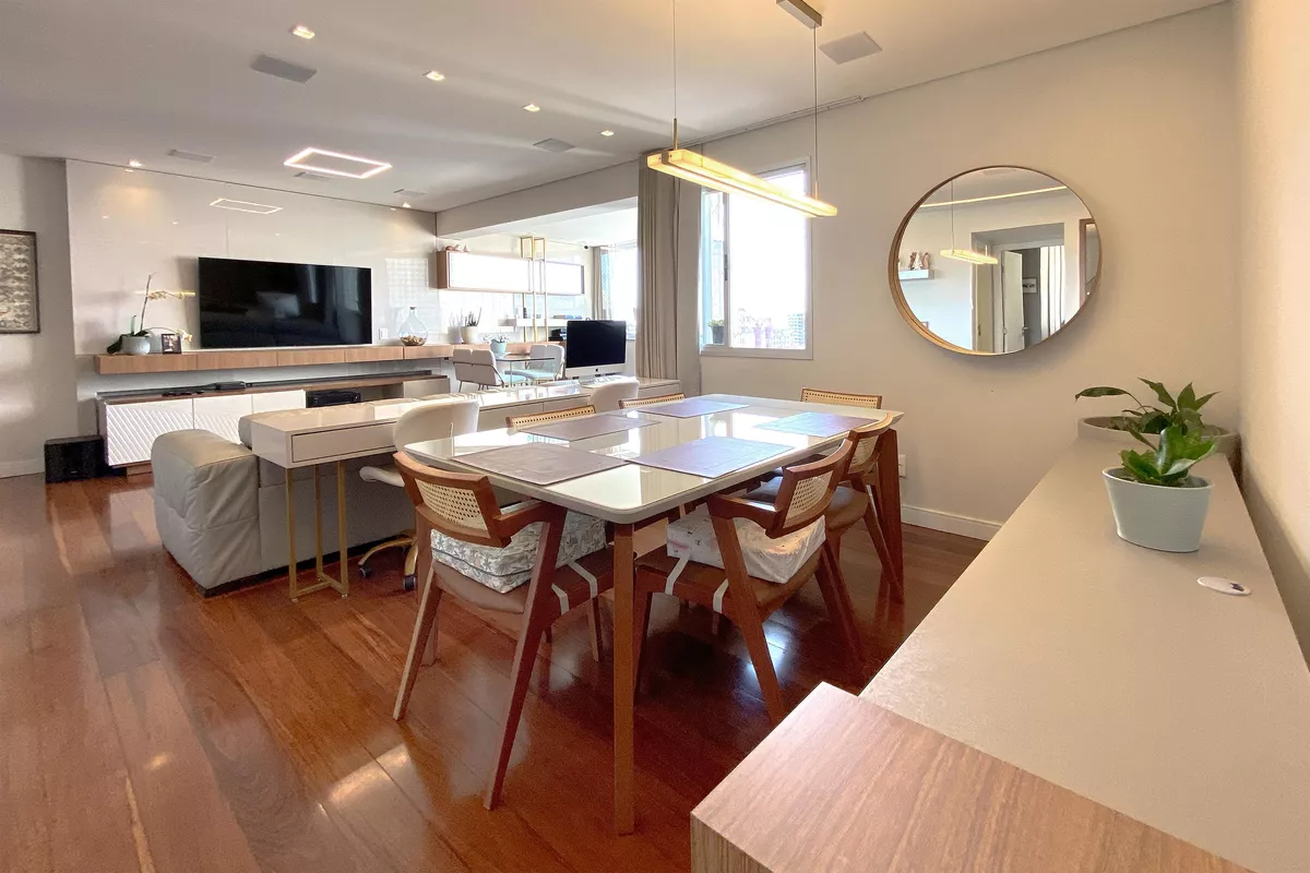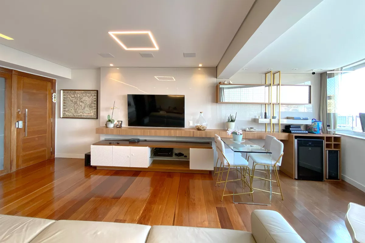 Sala em “L” para 3 ambientes com piso em tábua corrida, rebaixamento de teto com projeto luminotécnico e sonorização, painel, cristaleira; varanda integrada a sala; lavabo; 4 quartos, transformado em 3, sendo a suíte agora com um closet com excelentes armários, banhos com box, armários e espelhos; rouparia; cozinha totalmente planejada; área de serviço, despensa, armários e DCE; 2 vagas de garagem em linha, cobertas, demarcadas e box despejo.