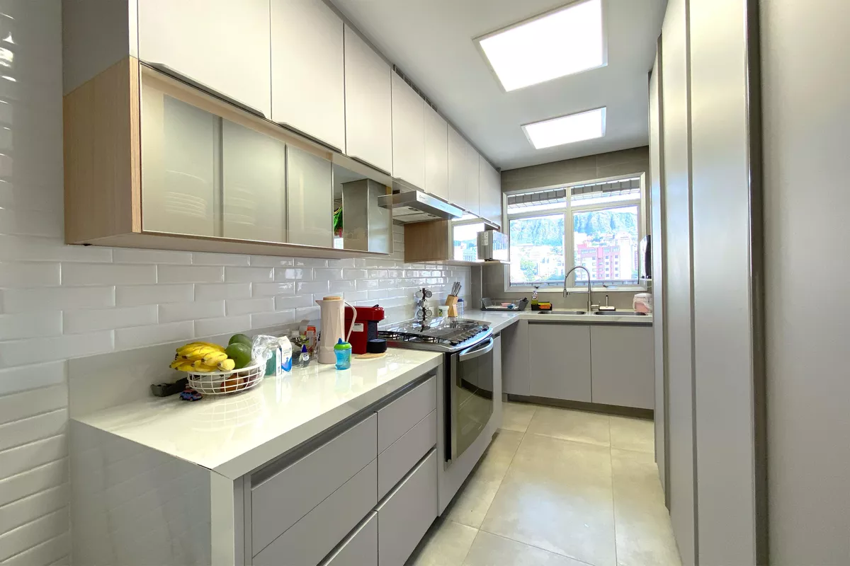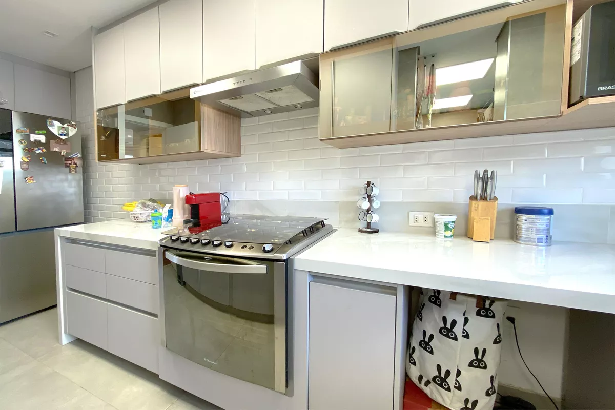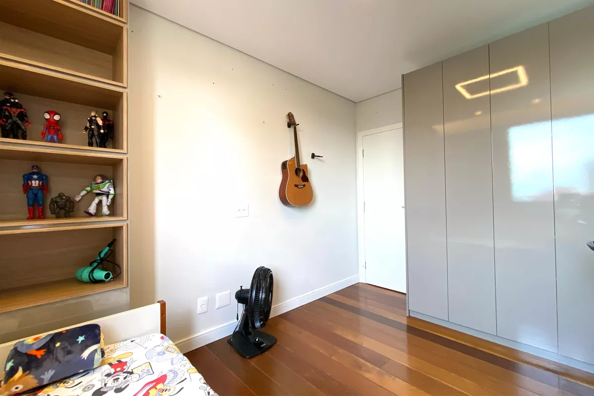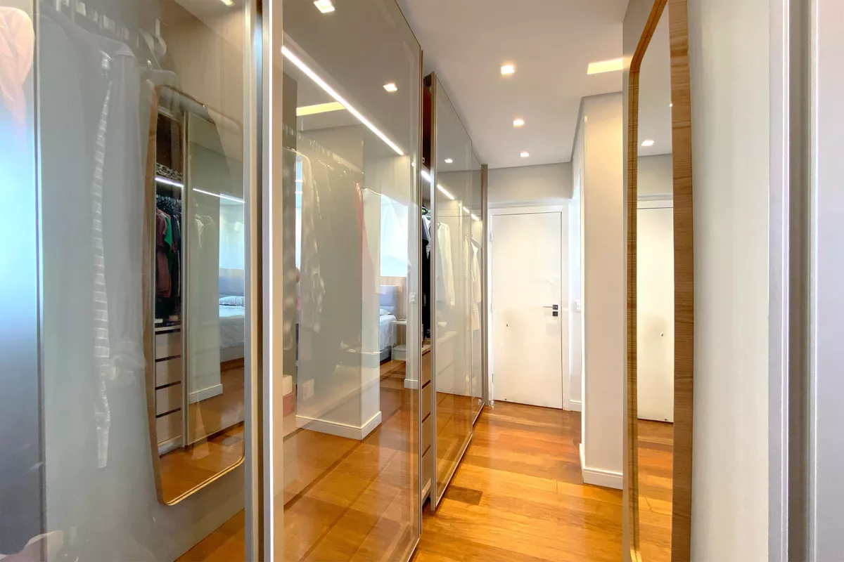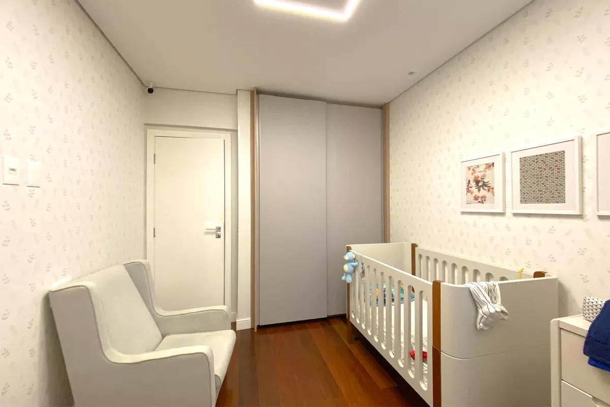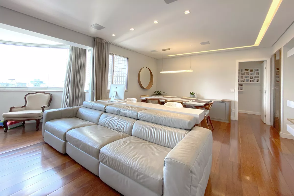 Sala em “L” para 3 ambientes com piso em tábua corrida, rebaixamento de teto com projeto luminotécnico e sonorização, painel, cristaleira; varanda integrada a sala; lavabo; 4 quartos, transformado em 3, sendo a suíte agora com um closet com excelentes armários, banhos com box, armários e espelhos; rouparia; cozinha totalmente planejada; área de serviço, despensa, armários e DCE; 2 vagas de garagem em linha, cobertas, demarcadas e box despejo.